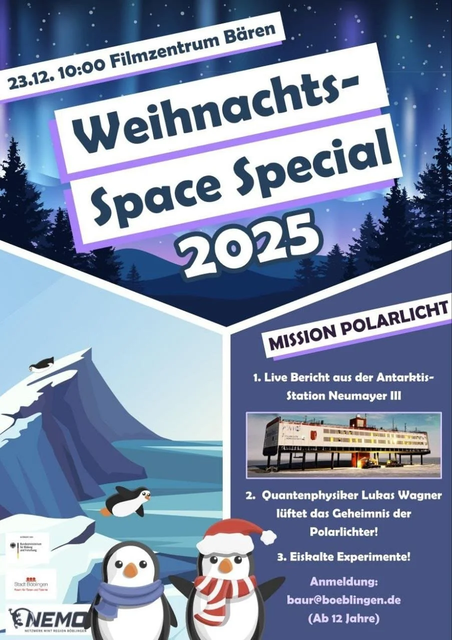 am 23. Dezember laden wir Euch ganz herzlich zu unserem Weihnachts-Space-Special ins Filmzentrum Bären in Böblingen ein.